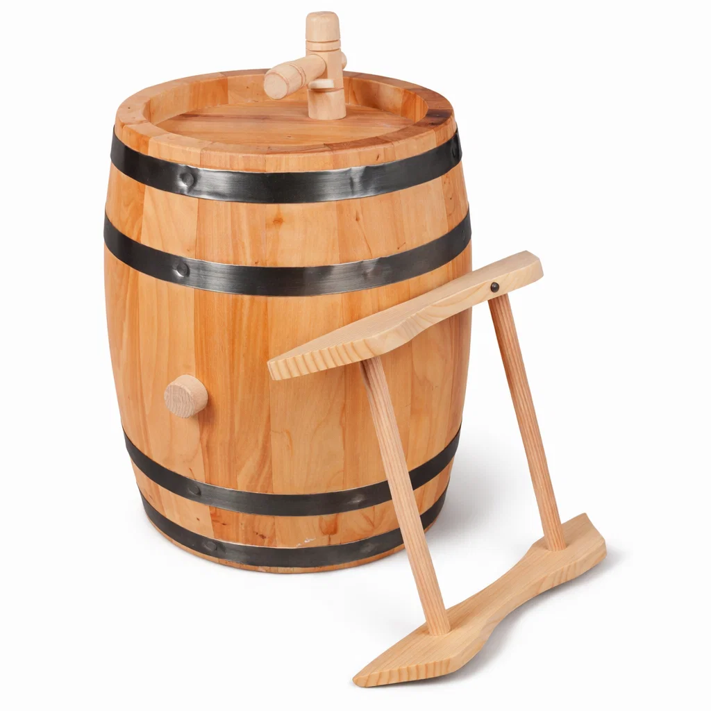Butoiul este realizat din lemn masiv de fag, un material utilizat tradițional în confecționarea recipientelor pentru lichide datorită structurii sale uniforme și rezistenței în timp. Lemnul este prelucrat astfel încât să asigure etanșeitate și stabilitate în utilizare.