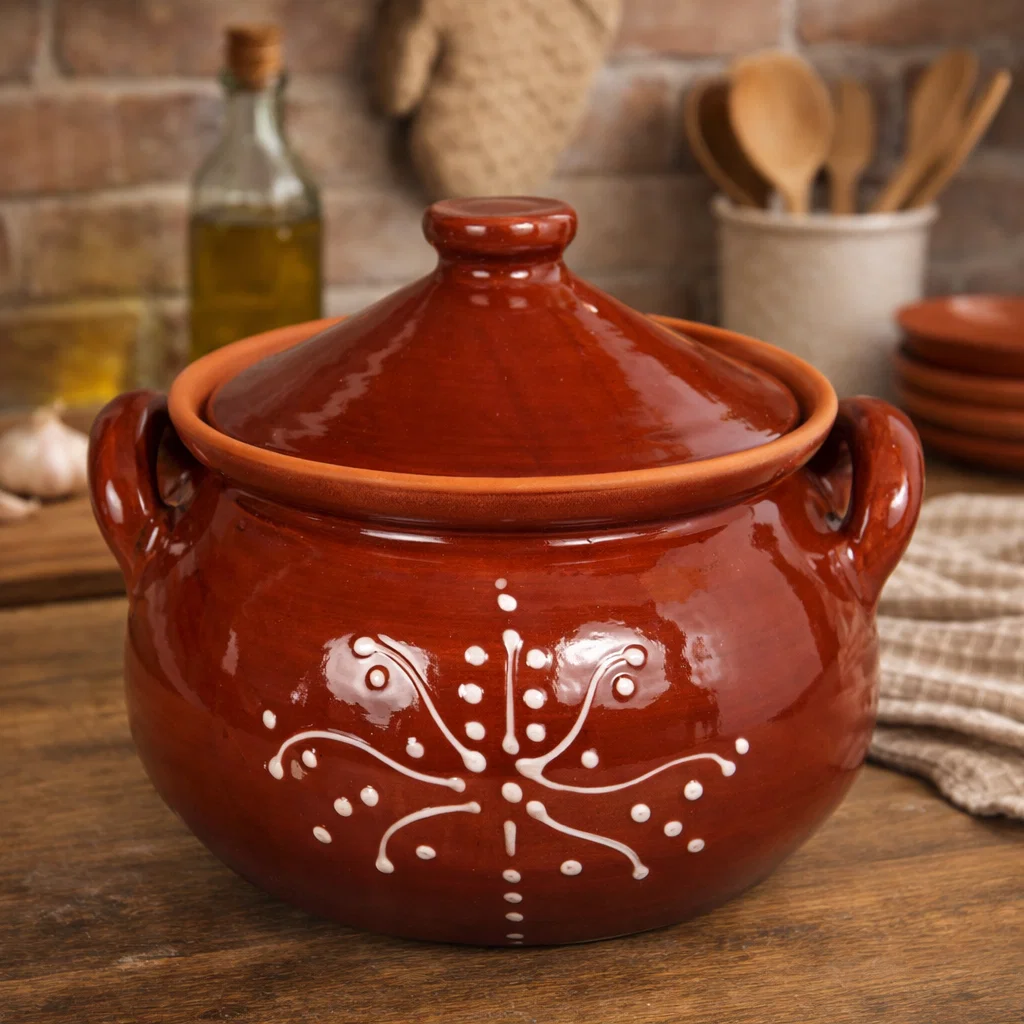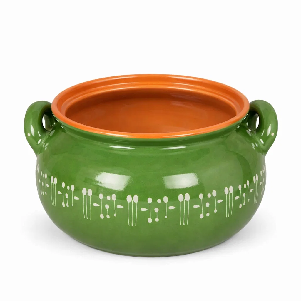 Oala din lut glazurată pentru sarmale și friptură, 5 litri este un vas de gătit destinat preparării lente la cuptor, realizat din lut natural ars și acoperit cu glazură alimentară. Este concepută pentru preparate tradiționale care necesită temperatură constantă și distribuție uniformă a căldurii.