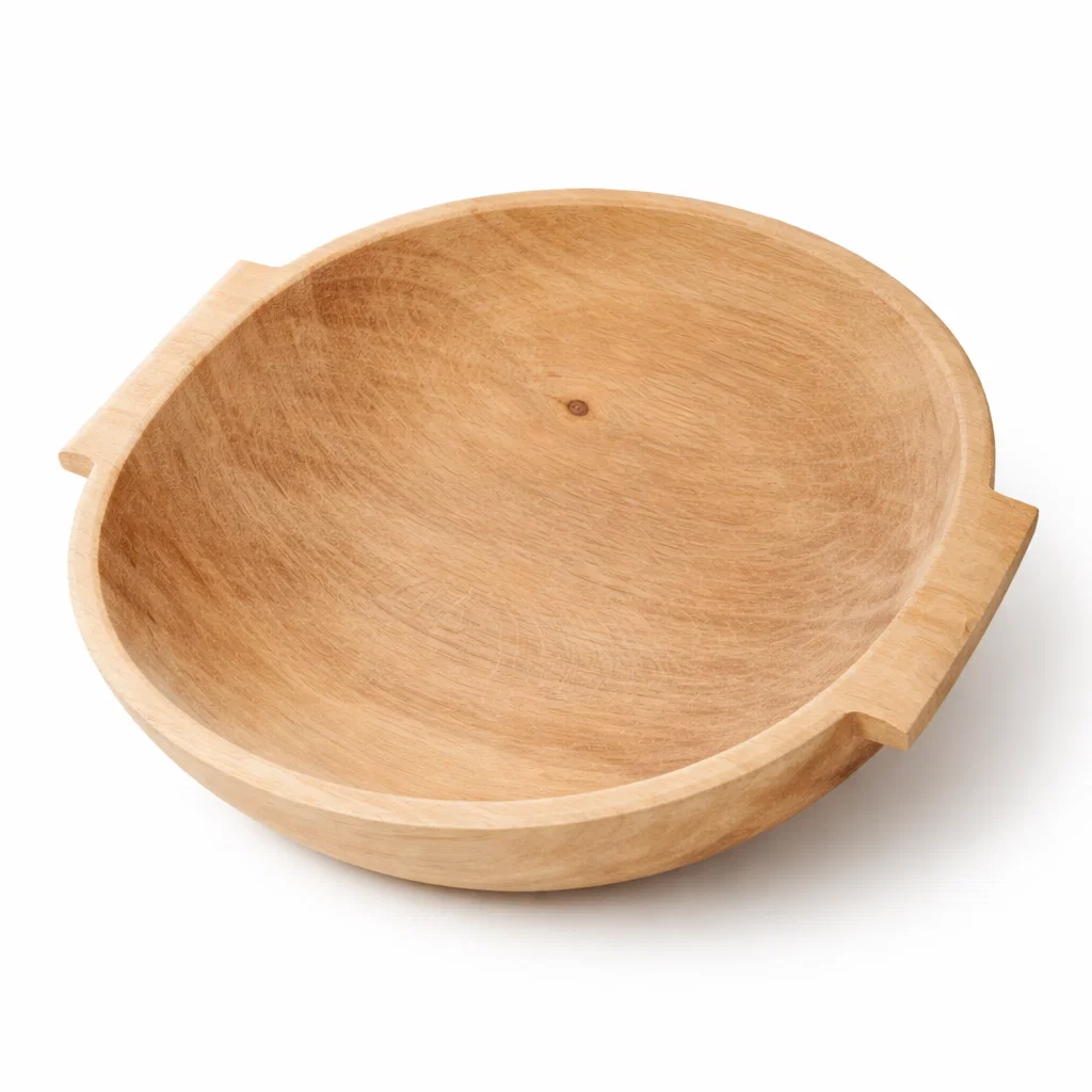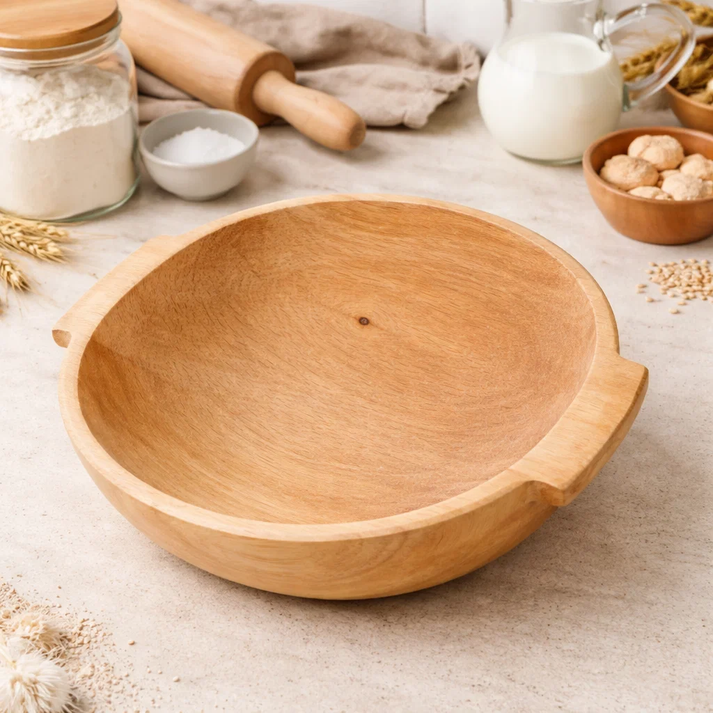 Covată rotundă din lemn de plop cu mânere, lucrată manual, ideală pentru frământarea aluatului. Practică, ușor de folosit și disponibilă în mai multe dimensiuni, potrivită pentru uz zilnic.