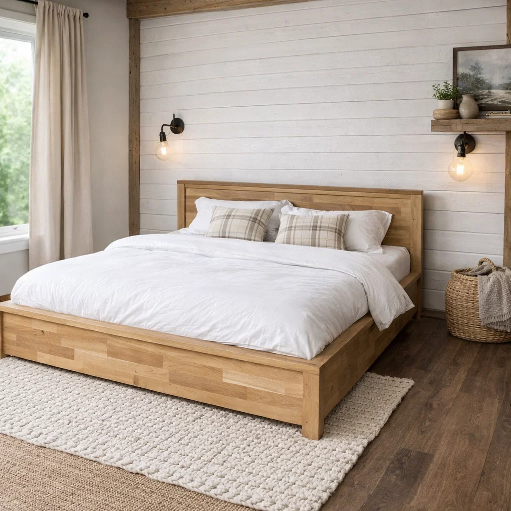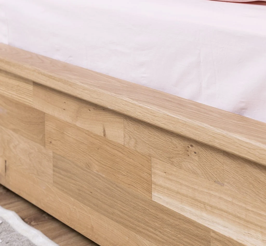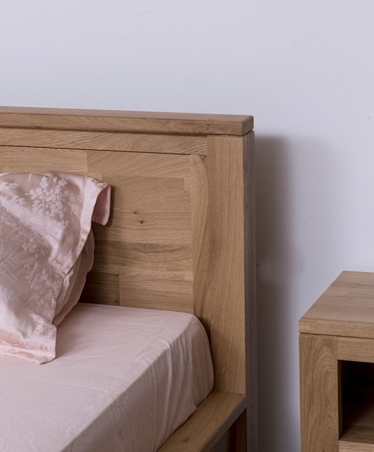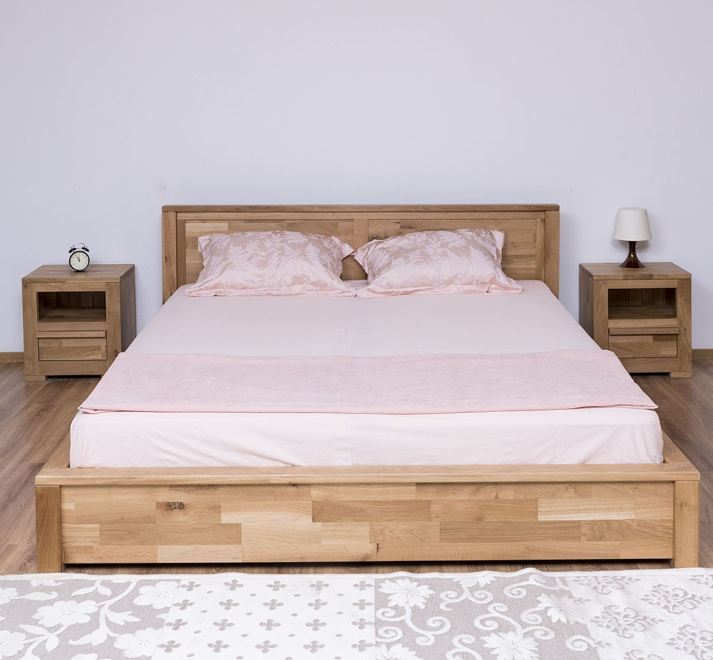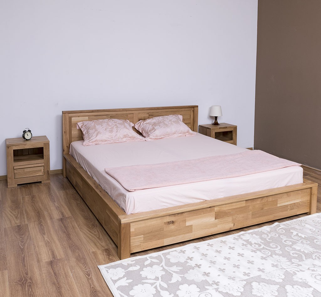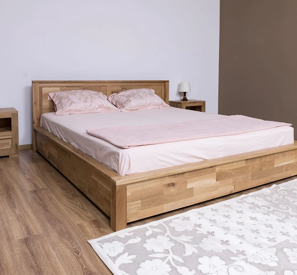 Pat matrimonial din lemn masiv de stejar 180x200 cm, robust și durabil. Finisaj lăcuit personalizabil la alegerea clientului. Compatibil cu saltele standard de dimensiunea 180x200 cm