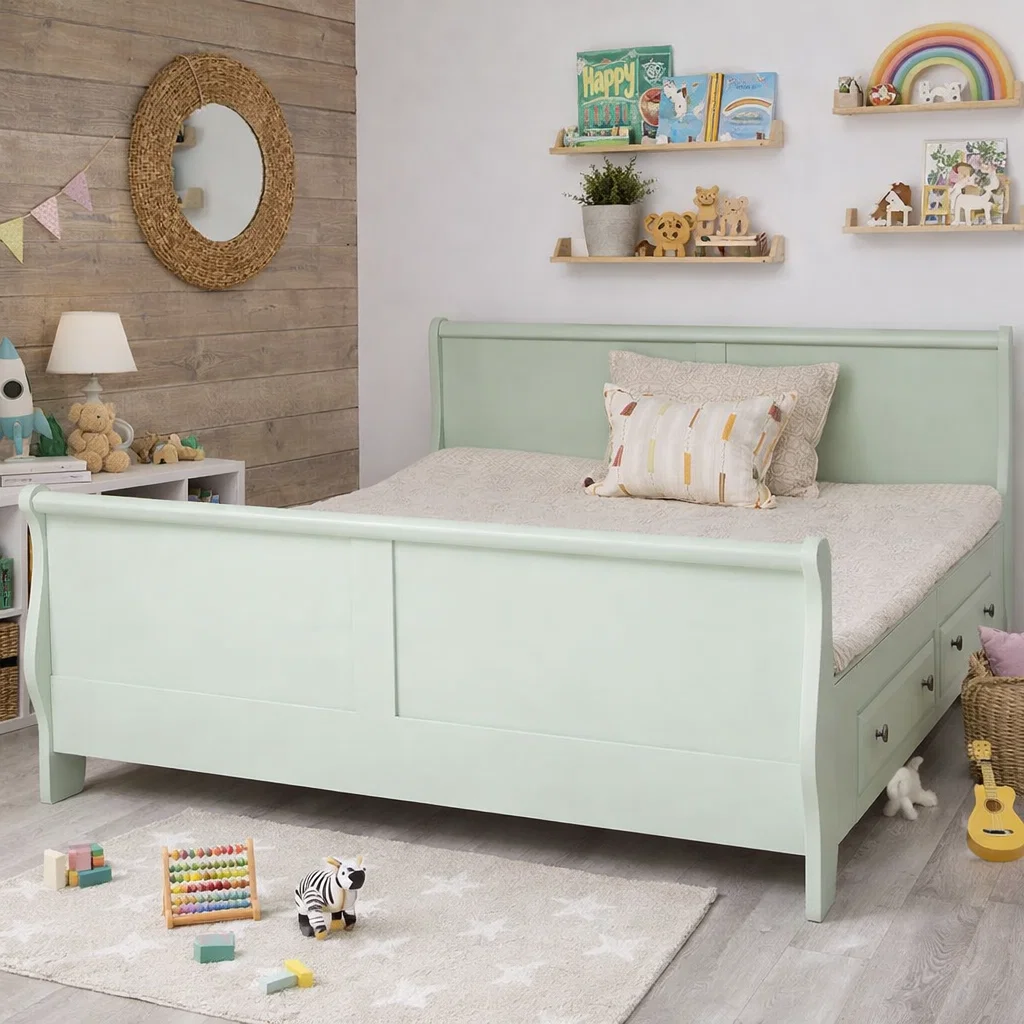 Structura realizată integral din lemn masiv oferă stabilitate, durabilitate și rezistență în timp, fiind o alternativă solidă la paturile din PAL sau MDF.