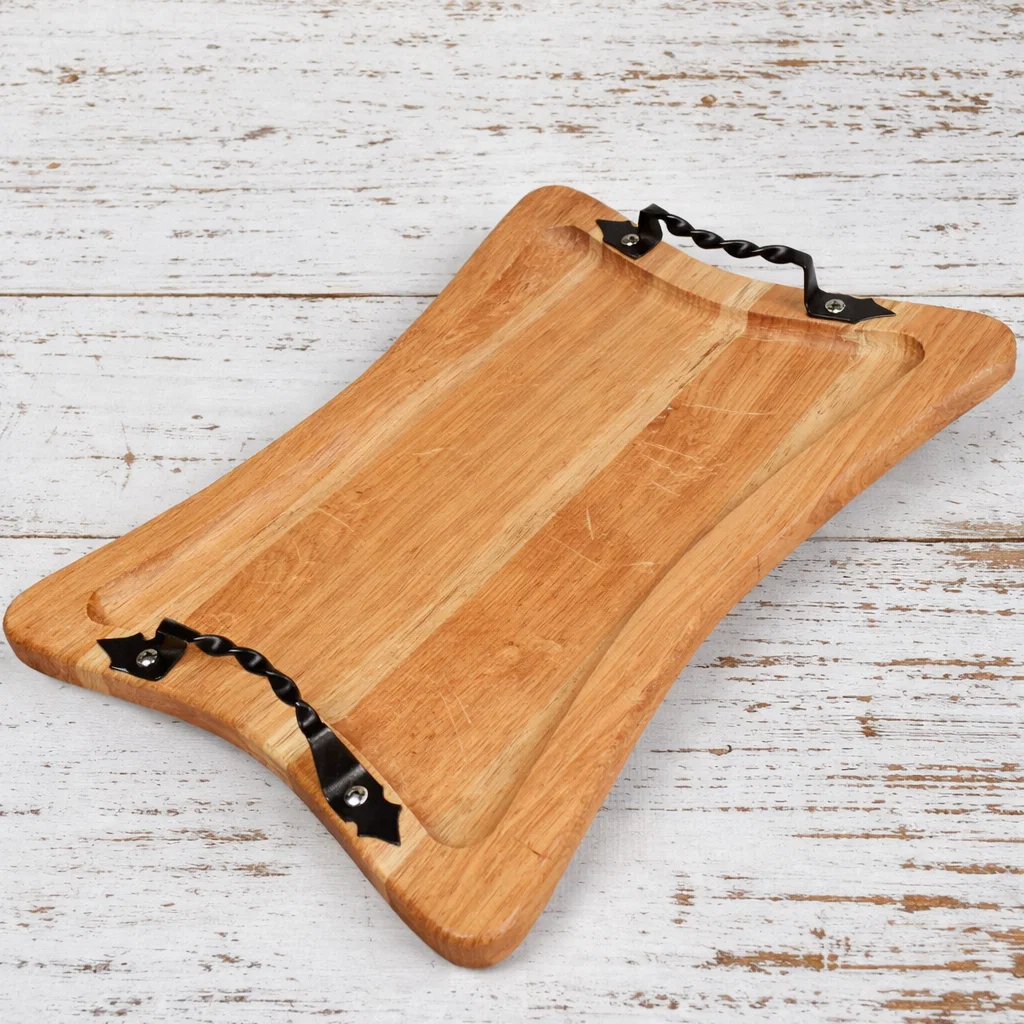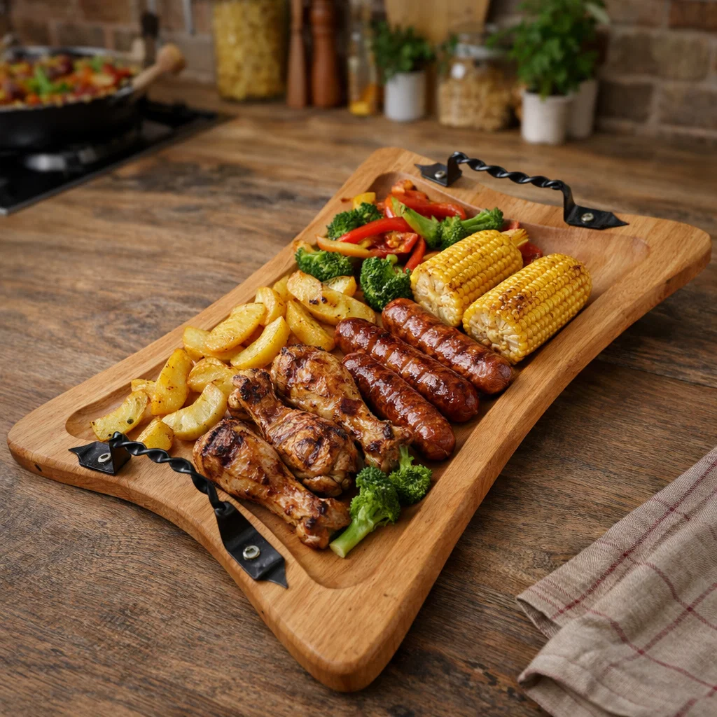 Tava din lemn cu mânere din fier forjat, 40x30 cm este un platou de servire realizat din lemn masiv, conceput pentru prezentarea și transportul în siguranță al preparatelor calde sau reci. Dimensiunea generoasă o face potrivită pentru fripturi, aperitive, burgeri, platouri tradiționale sau gustări pentru mai multe persoane.