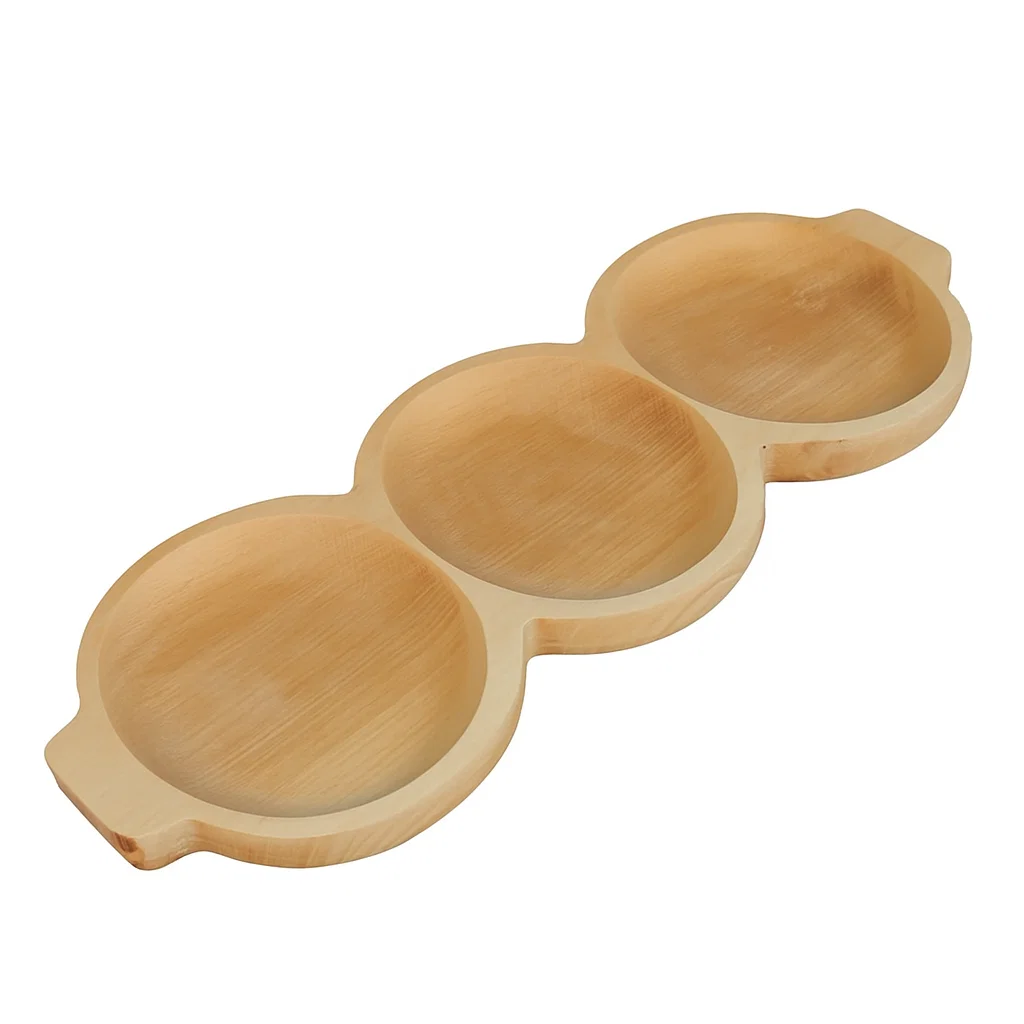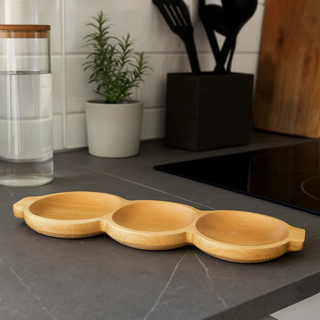 Descoperă eleganța naturală și funcționalitatea unui platou din lemn de fag cu 3 compartimente, realizat manual. Acest platou este alegerea perfectă pentru servirea aperitivelor, brânzeturilor, măslinelor sau fructelor uscate, combinând utilitatea cu un design rustic și modern în același timp.